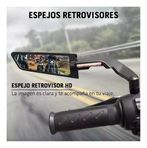 Retrovisores laterales de motocicleta con diseño aerodinámico tipo alerón, fabricados en aleación de aluminio de alta calidad. Cuentan con luces Direccionales LED integradas para mayor visibilidad y seguridad nocturna. Su diseño giratorio permite ajustar el ángulo de visión para garantizar una conducción más segura.