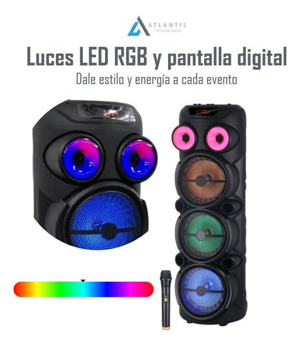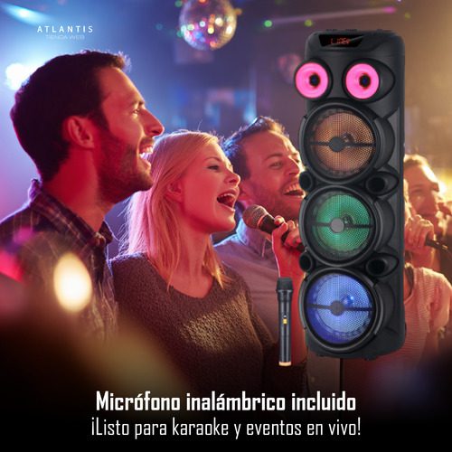 Incluye micrófono inalámbrico, control remoto y funciones de ajuste como agudos, graves y efecto Echo, para que tengas el control total del sonido. Su batería recargable de 4000 mAh ofrece varias horas de autonomía, ideal para llevarlo donde quieras sin depender de enchufes.
