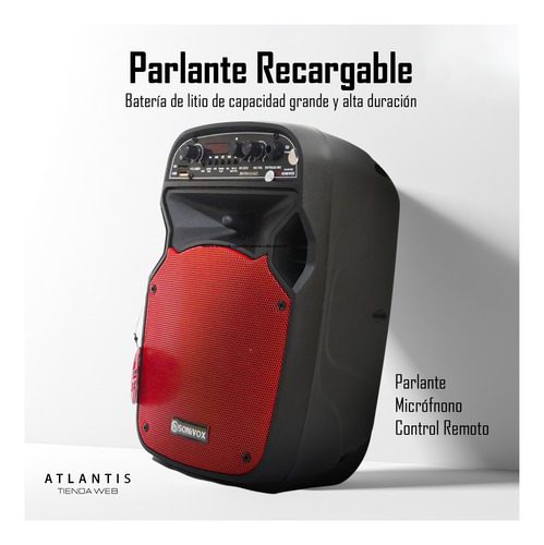 Cuenta con conectividad Bluetooth, radio FM, entradas USB, Micro SD y AUX, además de un micrófono alámbrico incluido, ideal para cantar, animar o hacer perifoneo. Su batería recargable de larga duración te brinda hasta 8 horas de reproducción continua, lista para llevar la música a todas partes.