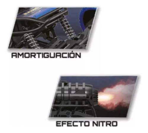 Auto todo terreno con efecto Nitro y amortiguación en las 6 ruedas, Funciona con radio control con sistema 2.4 GHz para recepción de largo alcance