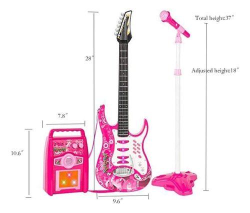 Accesorios completos: Este set viene con todos los accesorios necesarios para comenzar la diversión desde el primer momento, incluyendo calcomanías personalizables para que los niños puedan decorar su guitarra y hacerla suya. ¡Es ideal para pequeñas estrellas de rock!