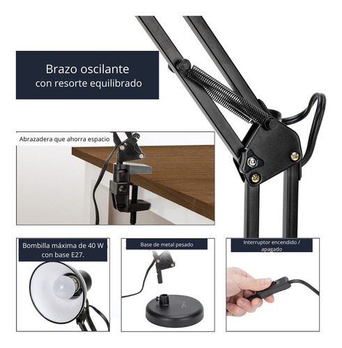 Es una gran lámpara de lectura. Integrado con pantalla y base de metal de alta calidad, resistente, duradera y estética. Esta lámpara de escritorio de arquitecto clásica puede satisfacer tus necesidades básicas de iluminación, perfectamente para leer, también de aspecto elegante como decoración.