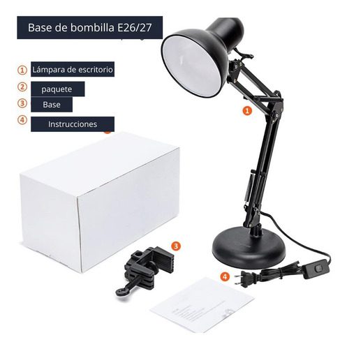 la bombilla no está incluida en el paquete de esta lámpara de escritorio con brazo oscilante. Con una base de tornillo de tamaño E26, E27, la bombilla se puede instalar como desee (40 W máximo). Es conveniente para reemplazar la bombilla fácilmente.