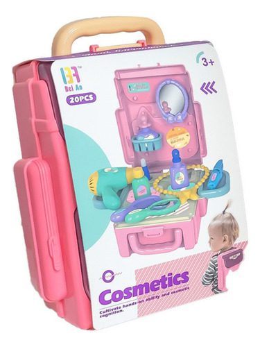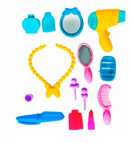 • 20 accesorios tipo cosméticos (cepillo, espejo, frascos, labial de juguete, perfumes, etc.)