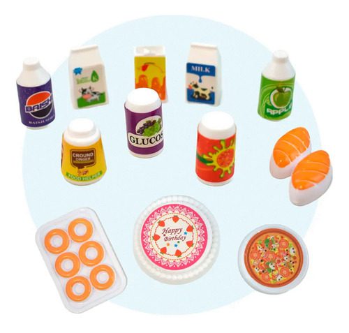 • Comida simulada: pizza, torta, helado, bandeja de donas, panes