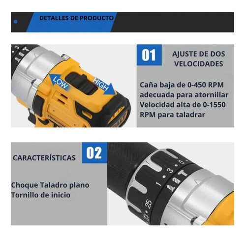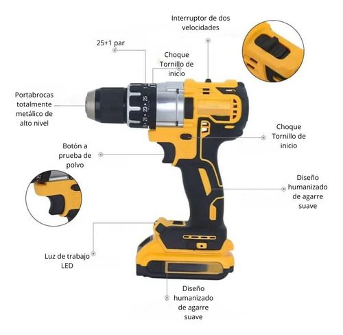 Taladro Inalámbrico Percutor 22 Voltios 2 velocidades 18 Engranajes De Torque con batería de iones de litio, multifuncional